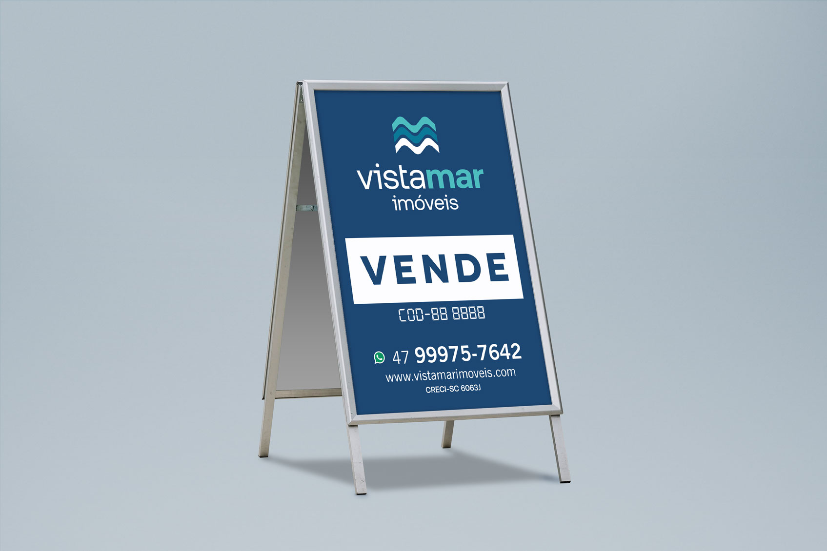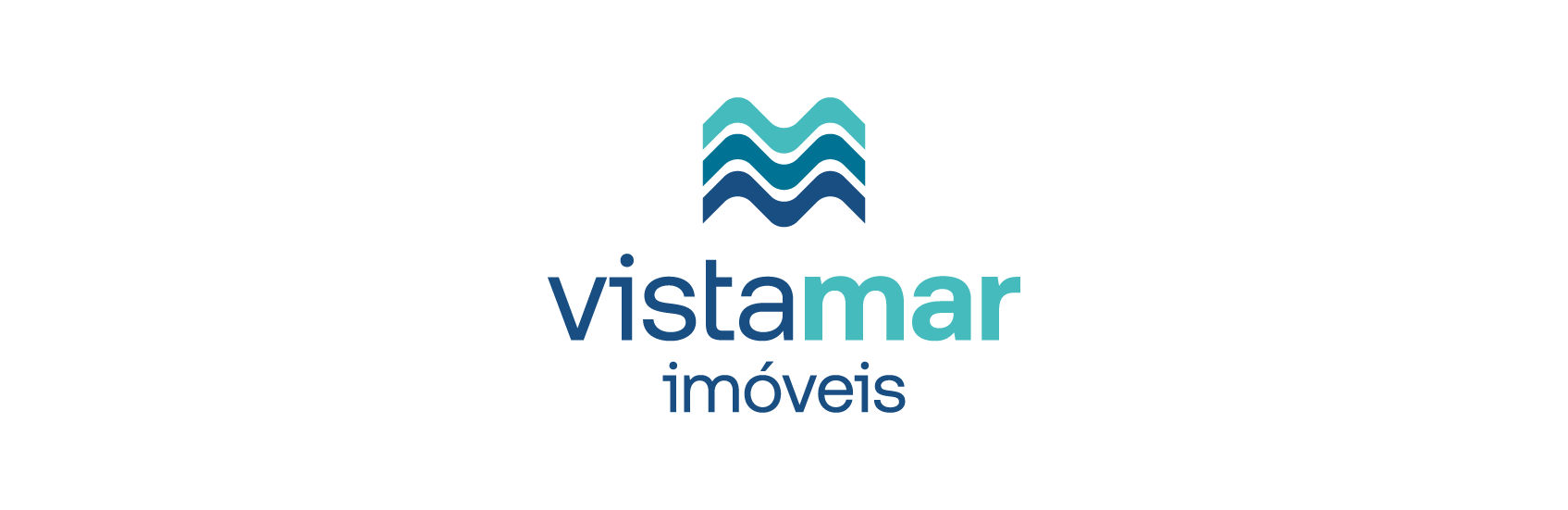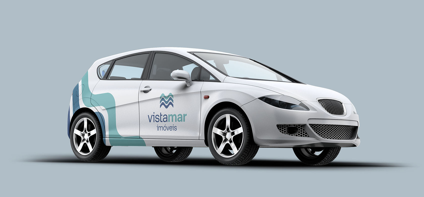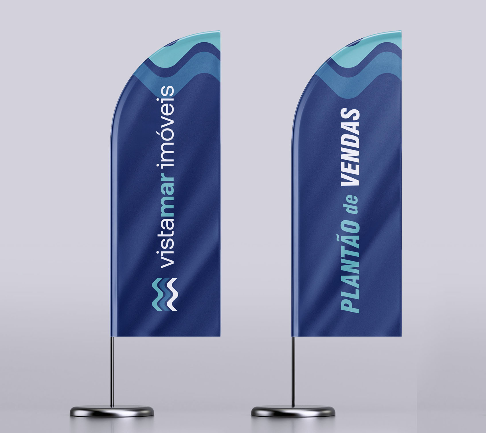VISTAMAR Imóveis. Criação de logotipo e sua aplicação em materiais impressos de papelaria, sinalização externa de sala comercial (fachada), placas e bandeiras, veículo.