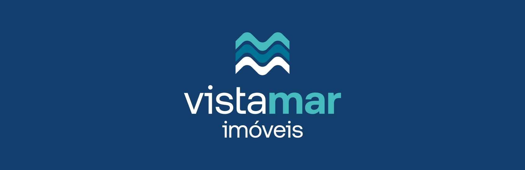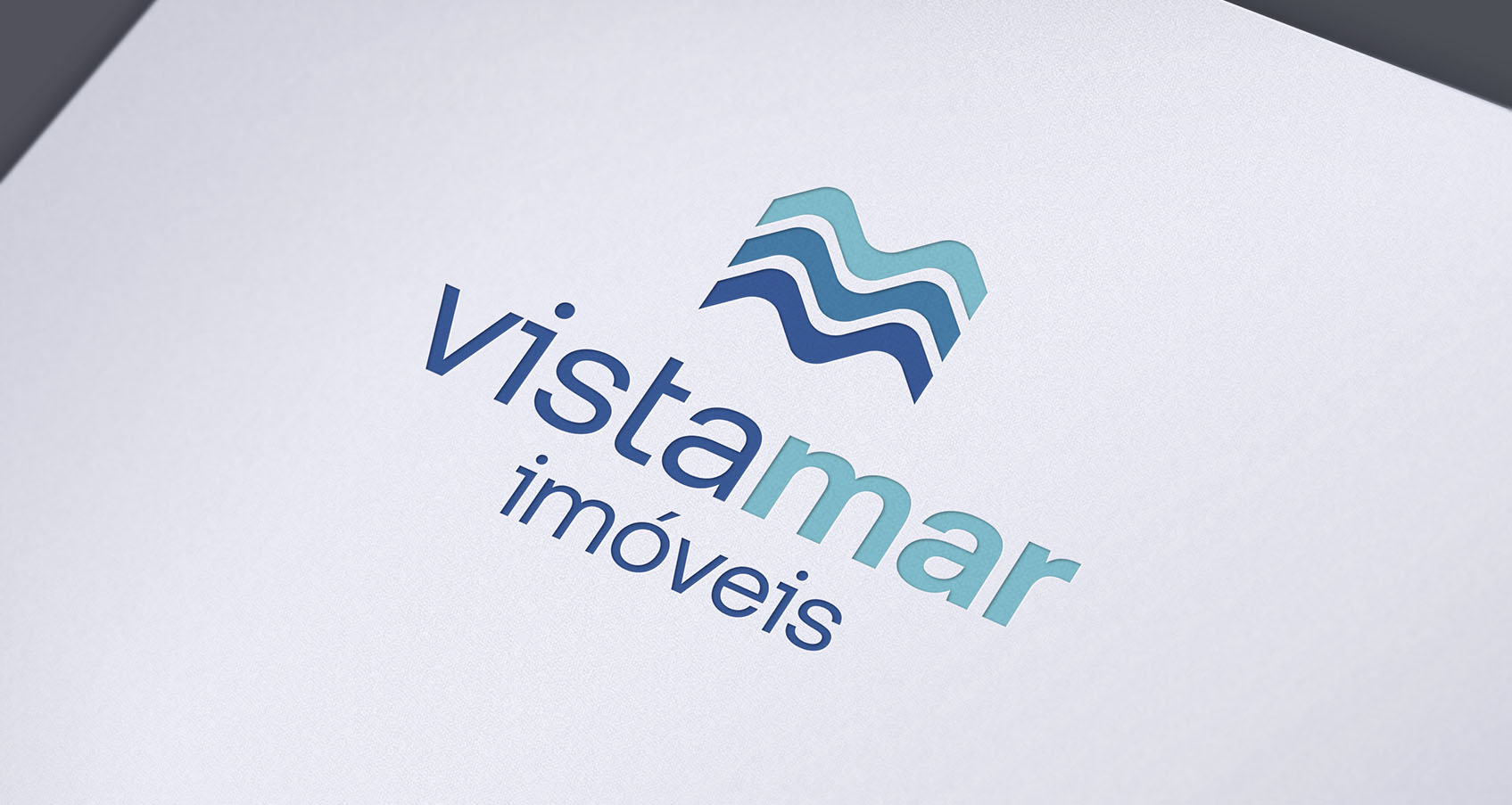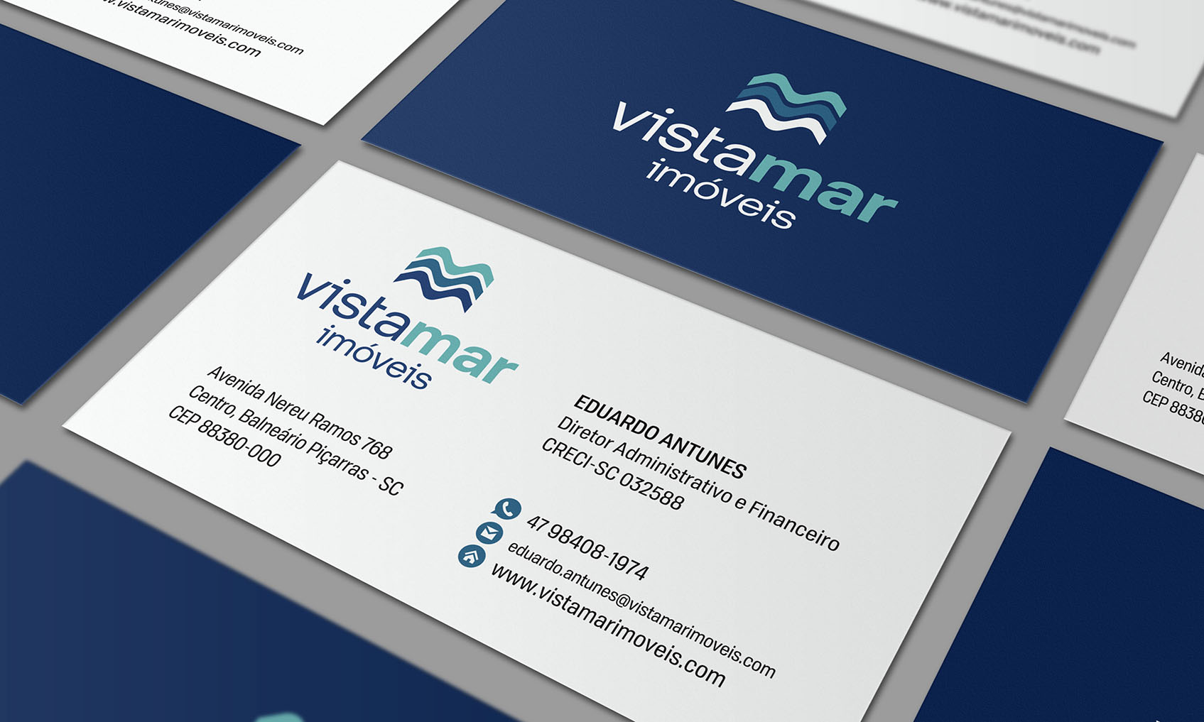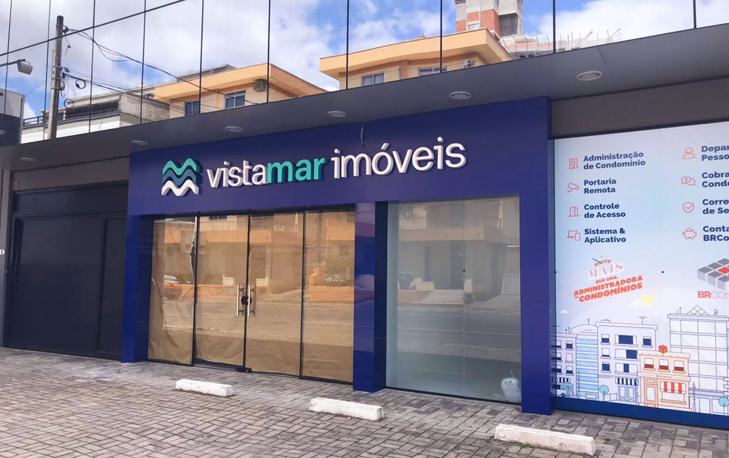 VISTAMAR Imóveis. Criação de logotipo e sua aplicação em materiais impressos de papelaria, sinalização externa de sala comercial (fachada), placas e bandeiras, veículo.