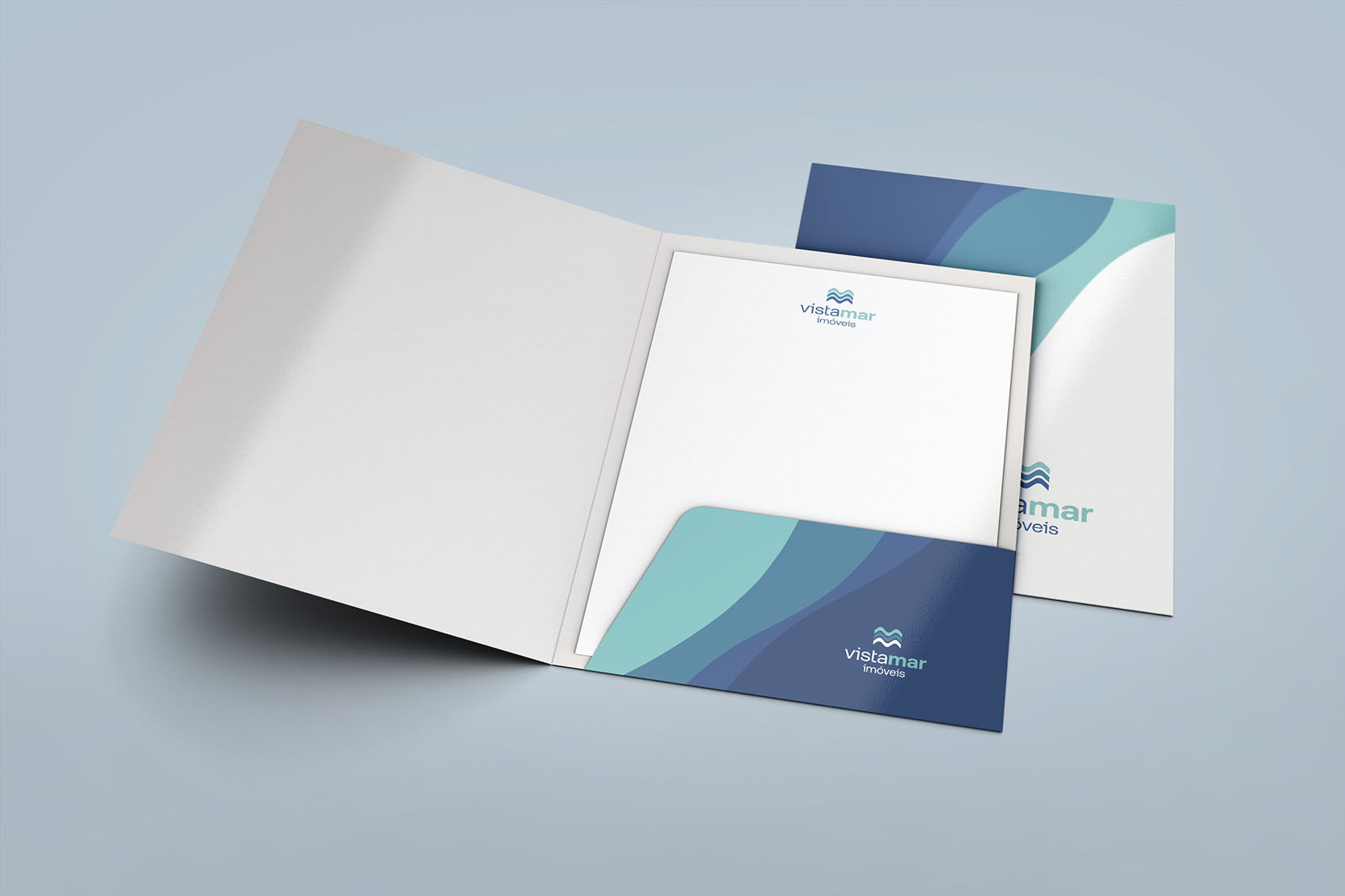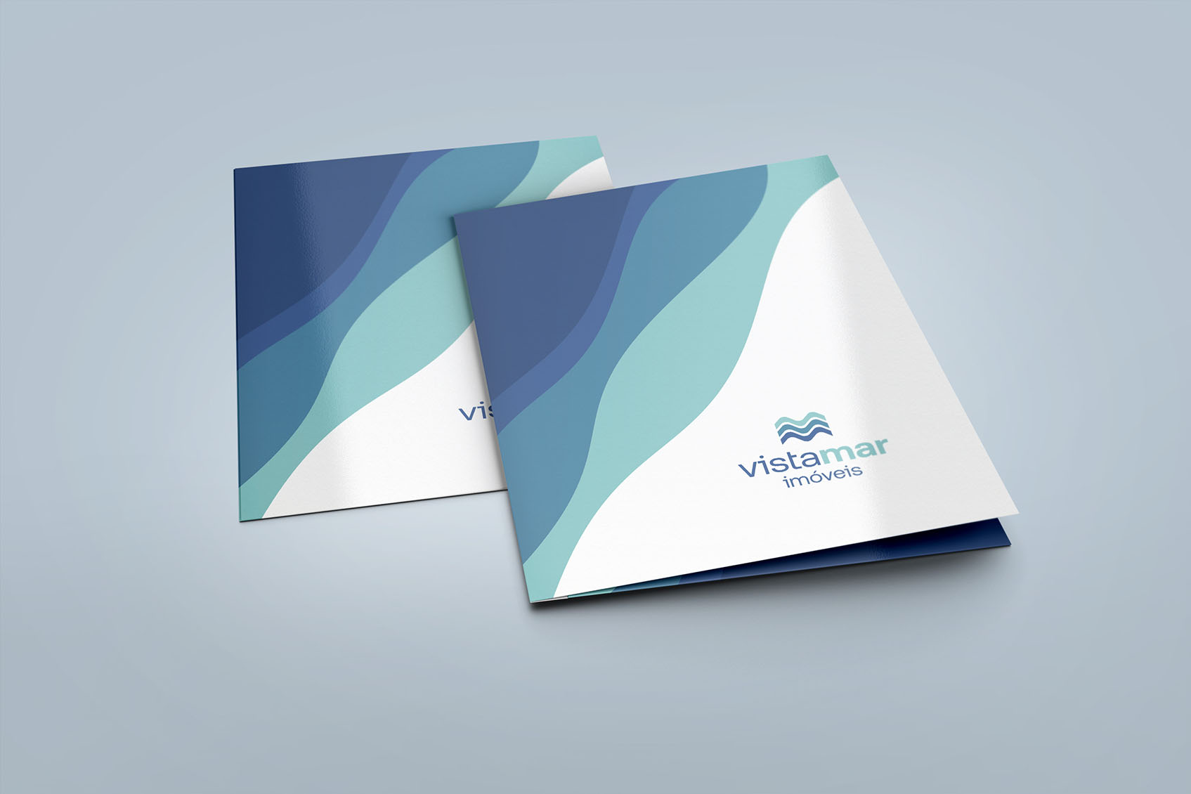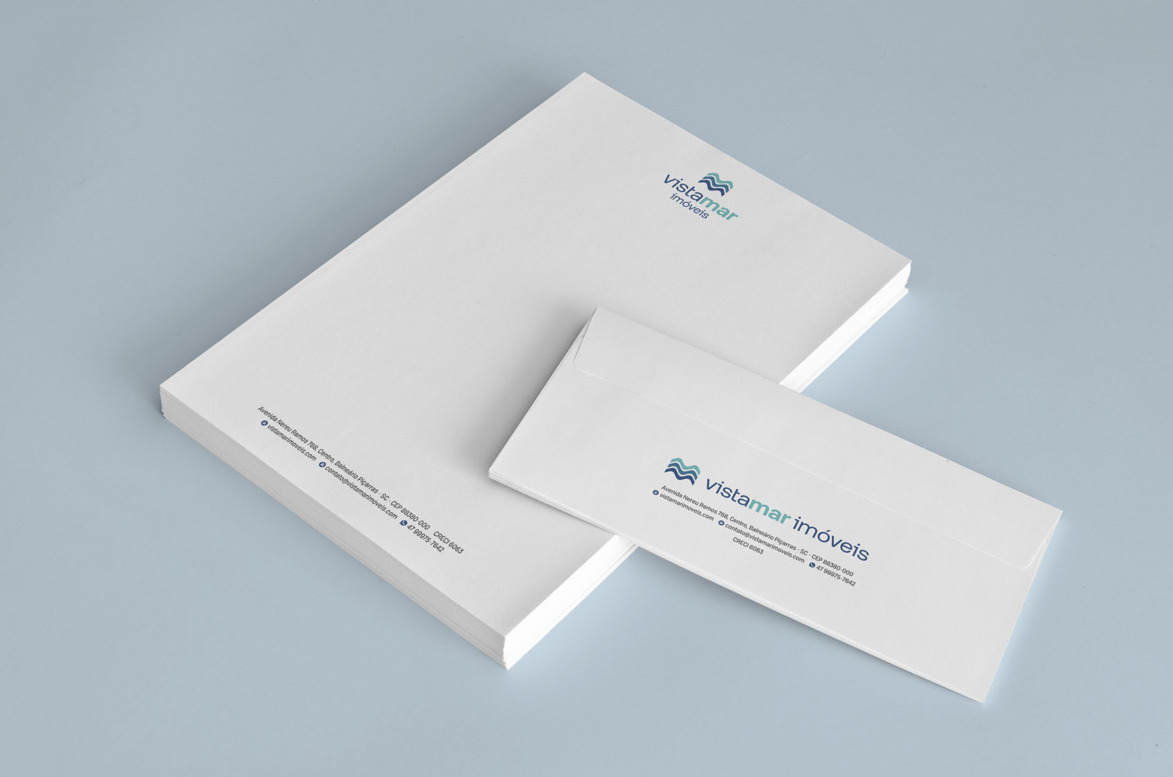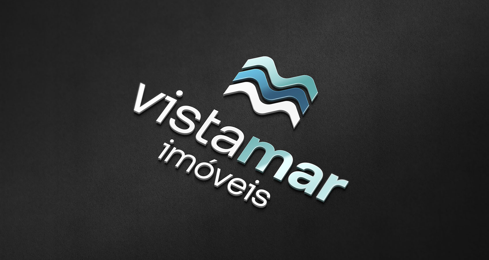 VISTAMAR Imóveis. Criação de logotipo e sua aplicação em materiais impressos de papelaria, sinalização externa de sala comercial (fachada), placas e bandeiras, veículo.