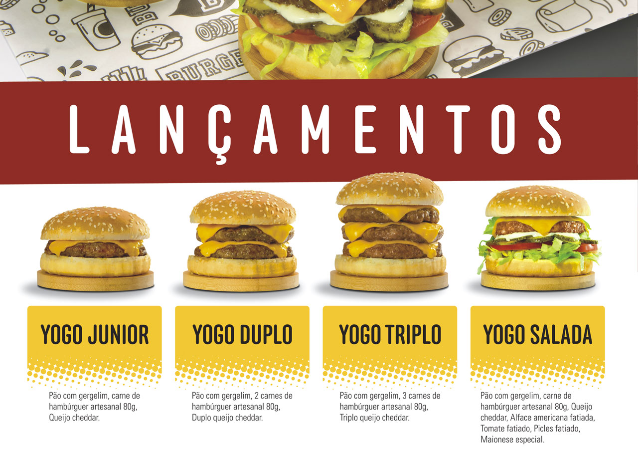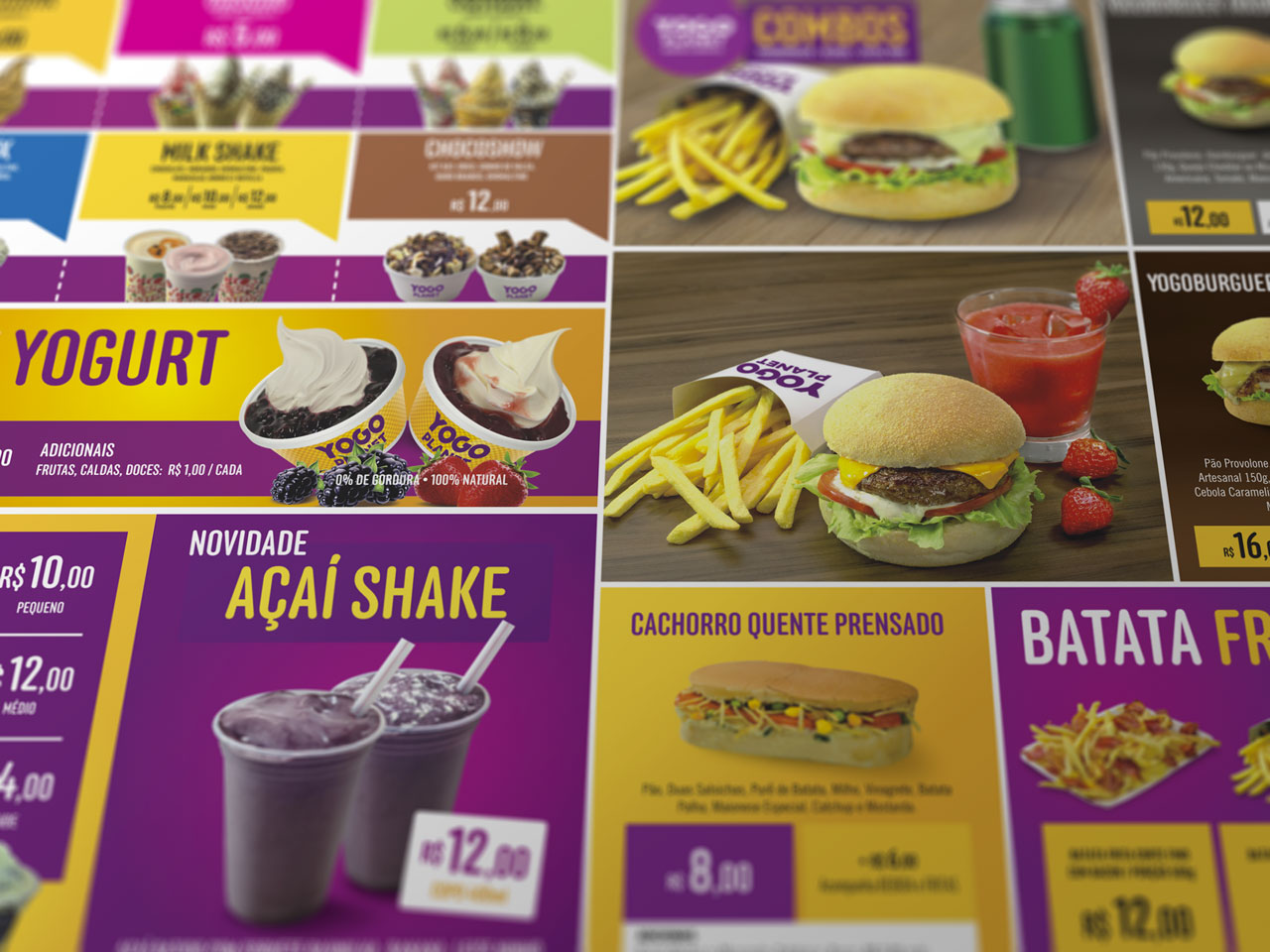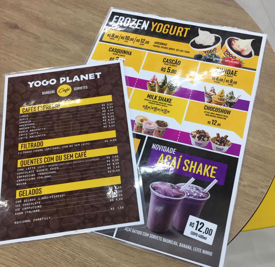 Rede da YOGO PLANET - Burgers, Sorvetes e Café, com diversas lojas em Santa Catarina. Fizemos o redesenho do logotipo, criação de fachada padronizada, incluindo layout da sinalização e projeto dos móveis e instalações internas. Materiais impressos: cardápios, banners promocionais, padronização de embalagens descartáveis, uniformes, cartões de visitas e etiquetas.
